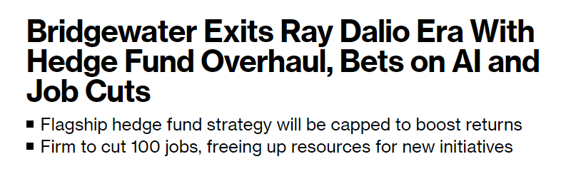 目前桥水正在限制其旗舰基金的规模,将更多的资金和人才投入到人工智能和机器学习中,扩大亚洲和股票市场的业务,并加倍致力于可持续性。为了削减成本并释放资源,它还将在未来两周内进行公司范围内的重组,裁员约100人,员工总数约为1,300人。