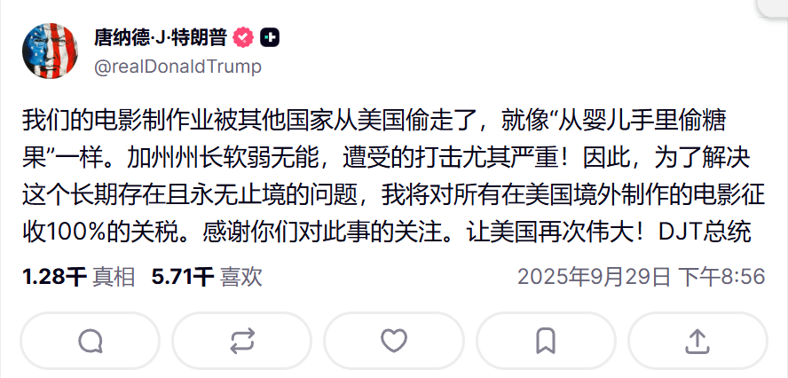 美国总统特朗普在“真相社交”平台上发文称,他将对“所有在美国境外制作的电影”征收100%的关税。